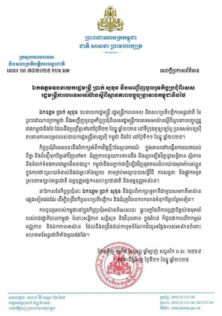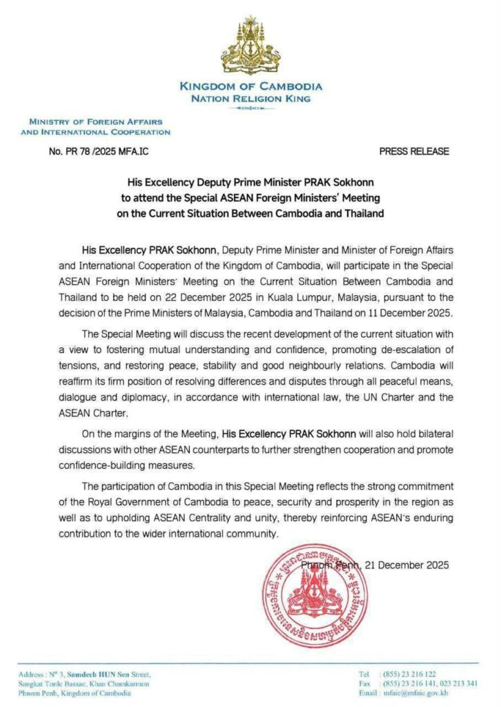 The Ministry of Interior of the Royal Government of Cambodia Issues a Press Release on the Impacts on Civilian Areas and Cambodian Civilians Resulting from Acts of Aggression by the Thai Government and Military Against Cambodia’s Sovereign Territory from 7:00 AM until 1:00 PM on 21 December 2025.