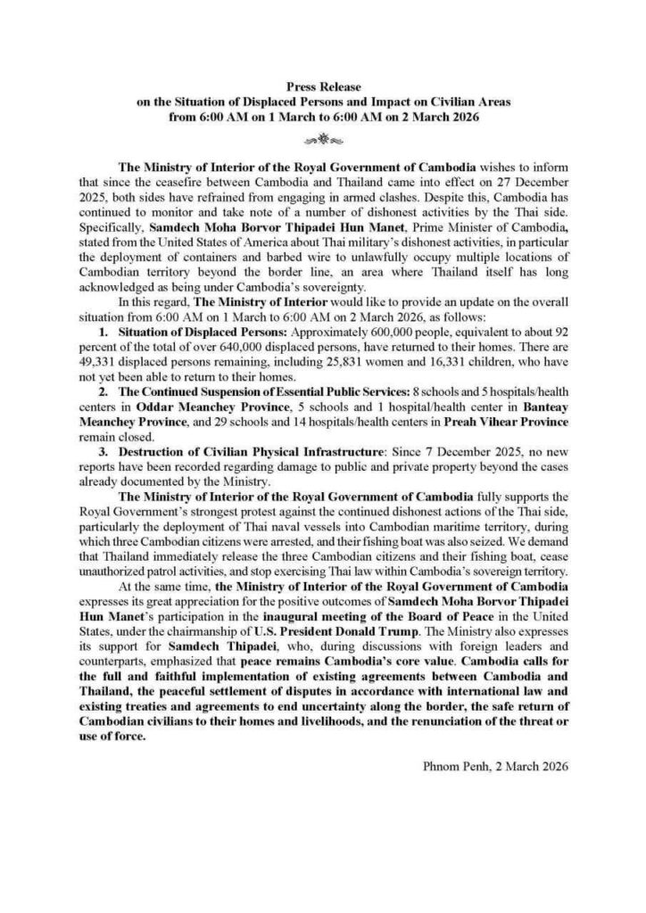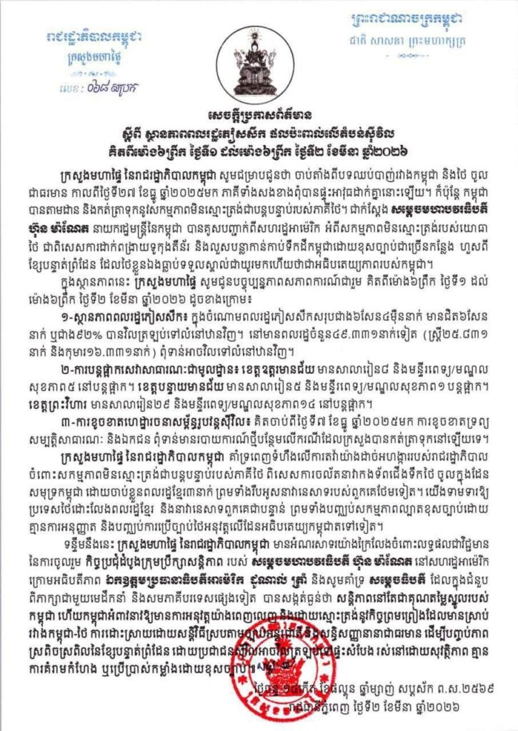 ក្រសួងមហាផ្ទៃ ចេញសេចក្ដីប្រកាសព័ត៌មាន ស្ដីពី ស្ថានភាពពលរដ្ឋភៀសសឹក និងផលប៉ះពាល់លើតំបន់ស៊ីវិល គិតត្រឹមព្រឹក ថ្ងៃទី២ ខែមីនា ឆ្នាំ២០២៦